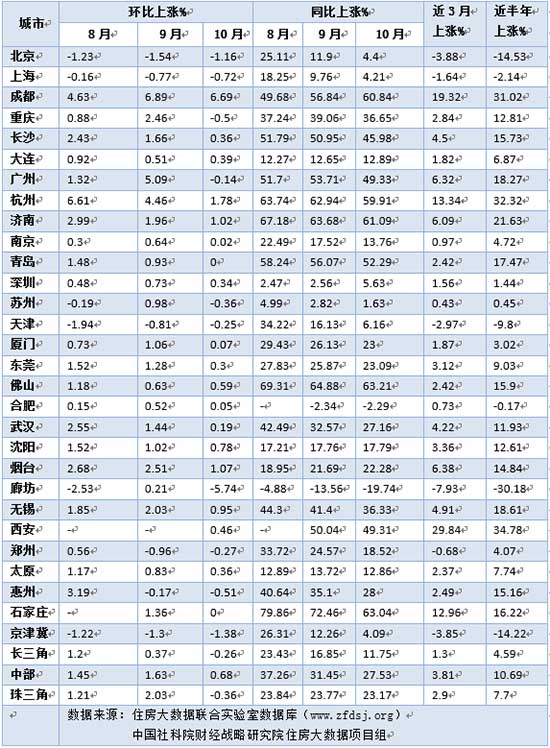 作為樓市重要風(fēng)向標(biāo)的北京,10月房?jī)r(jià)環(huán)比下跌1.16%,并已經(jīng)連續(xù)環(huán)比下跌6個(gè)月。只有成都10月房?jī)r(jià)環(huán)比上漲6.69%,漲幅顯著高于其它樣本城市。作為樣本城市環(huán)比漲幅第2名的杭州,10月房?jī)r(jià)僅環(huán)比上漲1.78%。而作為房地產(chǎn)投資投機(jī)典型城市的廊坊,10月環(huán)比大跌5.74%,居樣本城市跌幅之首