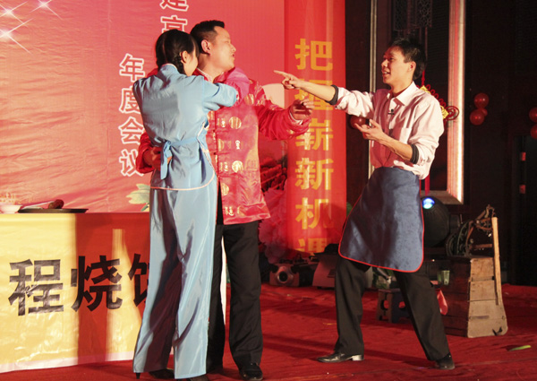 歌舞過(guò)后,順泰置業(yè)張沄、曾蓉、周小峰上演了小品《新上海灘》。小品講述了文強(qiáng)肉鋪攤主(張沄飾)、丁力修鞋攤主(周小峰飾)為討好、爭(zhēng)搶程程燒餅攤主(曾蓉飾)各懷心機(jī),最后因送情書(shū)而弄巧成拙的故事。巧妙的道具設(shè)置、真情的演出投入大大加強(qiáng)了舞臺(tái)效果,觀眾們?cè)诠恼茪g笑中,對(duì)人間愛(ài)情又有了一次直觀的感受。
