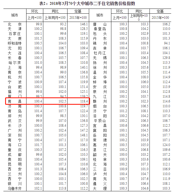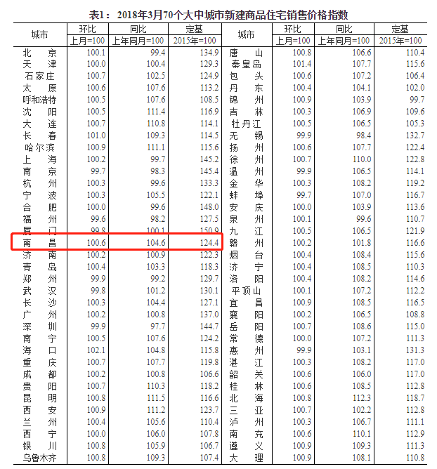今日,國家統(tǒng)計局發(fā)布2018年3月份70個大中城市商品住宅銷售價格變動情況,數(shù)據(jù)顯示,2018年3月南昌新建商品住宅價格指數(shù)環(huán)比上漲0.6%,二手房價格指數(shù)環(huán)比漲0.4%,南昌房價全面回漲。