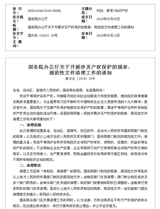 據(jù)中國政府網(wǎng)14日消息,國務(wù)院辦公廳日前發(fā)布關(guān)于開展涉及產(chǎn)權(quán)保護(hù)的規(guī)章、規(guī)范性文件清理工作的通知。根據(jù)通知,此次清理的范圍是省、自治區(qū)、直轄市、設(shè)區(qū)的市、自治州人民政府和國務(wù)院部門制定的規(guī)章,以及縣級(jí)以上地方各級(jí)人民政府及其所屬部門、國務(wù)院部門制定的規(guī)范性文件。清理的重點(diǎn)是,有違平等保護(hù)各種所有制經(jīng)濟(jì)主體財(cái)產(chǎn)所有權(quán)、使用權(quán)、經(jīng)營權(quán)、收益權(quán)等各類產(chǎn)權(quán)的規(guī)定,不當(dāng)限制企業(yè)生產(chǎn)經(jīng)營、企業(yè)和居民不動(dòng)產(chǎn)交易等民事主體財(cái)產(chǎn)權(quán)利行使的規(guī)定,以及在市場(chǎng)準(zhǔn)入、生產(chǎn)要素使用、財(cái)稅金融投資價(jià)格等政策方面區(qū)別性、歧視性對(duì)待不同所有制經(jīng)濟(jì)主體的規(guī)定。(每日經(jīng)濟(jì)新聞)