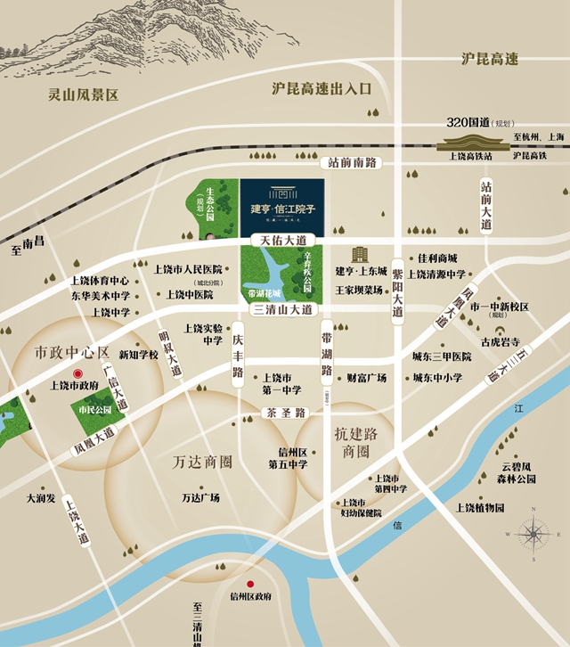 而建亨·信江院子取址信州新區(qū)正北,是城市的正位,位處帶湖西板塊和城東高鐵經(jīng)濟板塊的雙核心地塊,東邊直達(dá)上饒高鐵站、南面是重點規(guī)劃中的辛棄疾文化公園,西側(cè)是公共綠地,居住環(huán)境極佳。