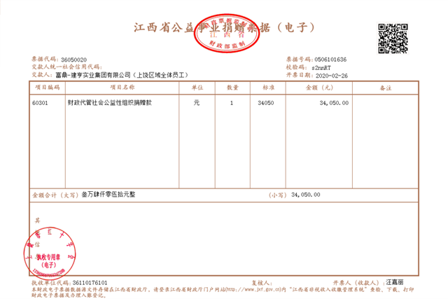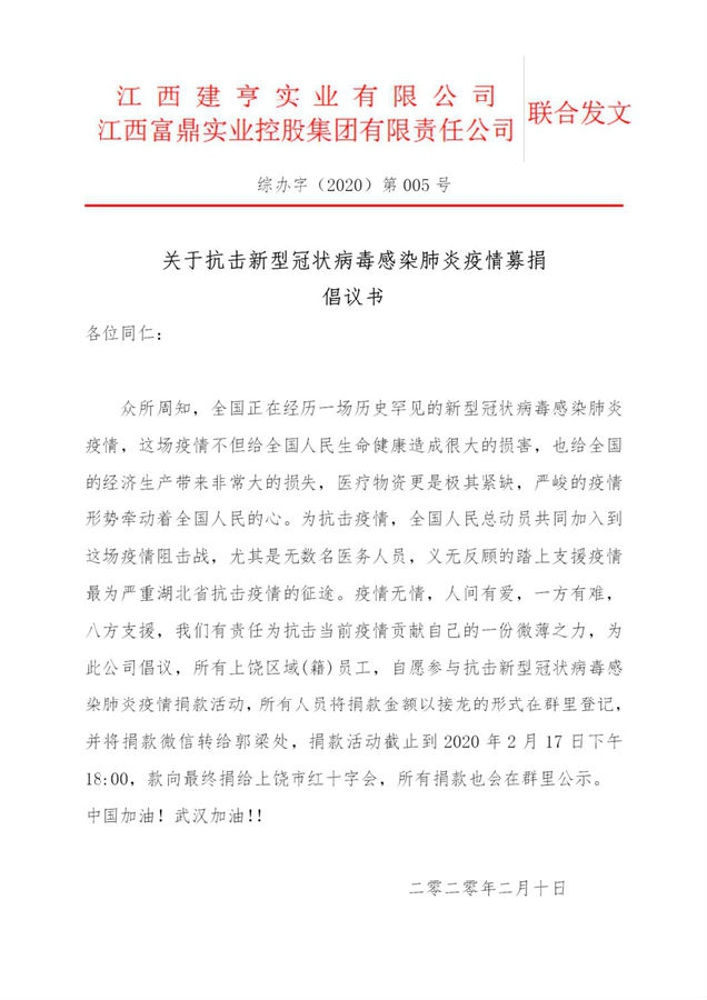 2月26日,富鼎-建亨集團(tuán)員工捐贈(zèng)34050元,支持饒城抗擊新冠狀病毒感染的肺炎疫情。該筆款項(xiàng)將由上饒紅十字會(huì)統(tǒng)籌,優(yōu)先用于購(gòu)買當(dāng)前疫情防控急需的醫(yī)療物資,以及對(duì)一線醫(yī)護(hù)人員進(jìn)行幫助。
