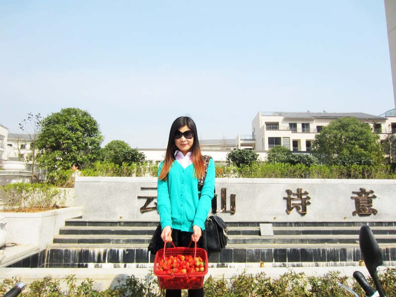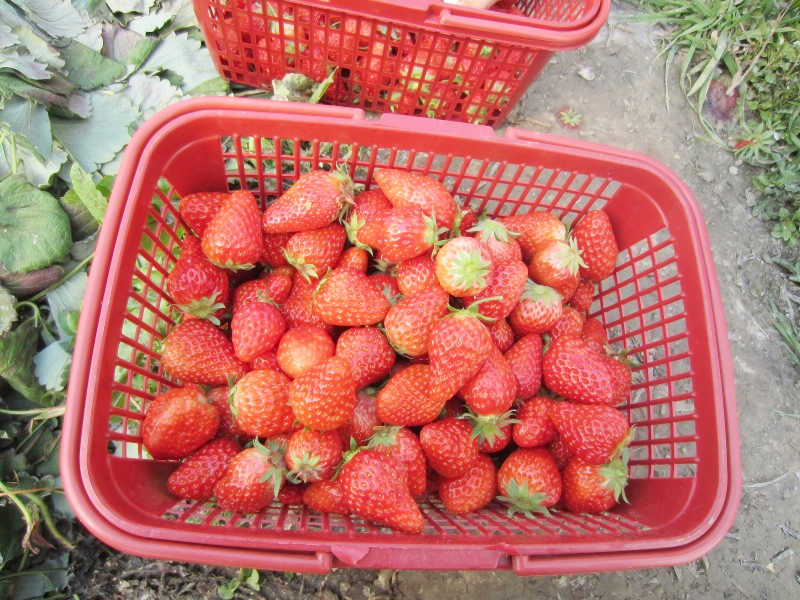 一路上,大家個個興奮極了,騎著各自的“小毛驢”歡聲笑語。抵達(dá)目的地后,只見一排排白色塑料布搭起的蓬子整齊的排列著,像幾條銀蛇在寬闊的田野里游動,大家都迫不及待地下了車,提著籃子各自進(jìn)了蓬子。忽然,一陣草莓的清香撲鼻而來,放眼望去,蓬子里像鋪上了一層綠色的地毯,草莓花不多,零零星星點綴著,如同碧天里的星星。這時,大家都忙彎下腰,急切地尋找那些穿著紅衣服、戴著綠帽子的“小娃娃”,把它們美滋滋地放在自己的籃子里。將近中午,只見每個人的籃子里面都裝滿了誘人的大草莓,于是大家提著各自的勞動成果滿載而歸。