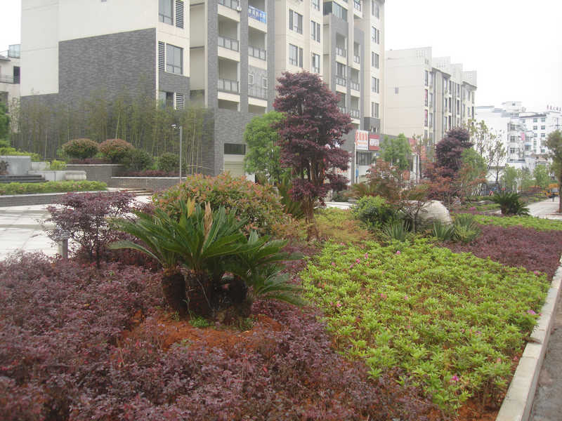 2 、充分考慮植物季相的變化。本工程植物造景注重季相的變化,考慮到四季枝葉的變化。根據(jù)植物的性狀,以豐富的植物種類形成春花爛漫、夏蔭濃郁、秋色絢麗、臘梅飛雪 的四季景觀。觀花植物貫穿于春夏秋冬。如春季的觀花植物有春鵑、山茶、茶梅、紅花繼木、紫玉蘭、黃玉蘭、樂昌含笑、櫻花、垂絲海棠、紅碧桃、紫荊、含笑、香泡等。夏季開花的植物有木槿、廣玉蘭、夾竹桃、豐花月季、紅花六月雪等。秋季開花的有金桂、黃山欒樹、夾竹桃、木芙蓉、紫薇、夏鵑、合歡、絲蘭、花石榴等。冬季觀花的植物有黃臘梅、紅梅、結香等。在本工程中,不僅有大量觀花的植物,還種植了很多觀葉的植物,如紅葉石楠、紅楓、烏桕、金絲垂柳。每當紅葉石楠新葉長出的時候,枝頭上紅艷艷的,煞是好看!深秋季節(jié),葉子火紅的烏桕,紅楓很是醒目,大有“停車坐愛楓林晚,霜葉紅于二月花”的意境。深秋季節(jié)的欒樹,葉色變黃,果實紫紅,形似燈籠,十分美麗。冬季的無患子,滿樹金黃,猶如一棵“黃金樹”。還有芭蕉、八角金盤、曬金珊瑚等等,都是很好的觀葉植物。在本工程中,不僅有觀花和觀葉的植物,還根據(jù)居住區(qū)綠化種植的特點,種植了居民都喜歡的花果植物,如枇杷樹、香泡樹等等。給忙忙碌碌的人們創(chuàng)造“一年四季君須記,最是橙黃桔綠時”的意境。桂花是我地人們很喜歡的一個品種,因此,在各區(qū)塊、宅間種植了金桂、銀桂、四季桂等大小各種桂花180余株,每到金秋季節(jié),滿樹金黃,滿園飄香,進入小區(qū)的人們,想必會心曠神怡吧!