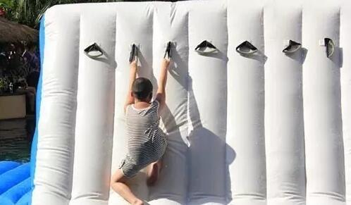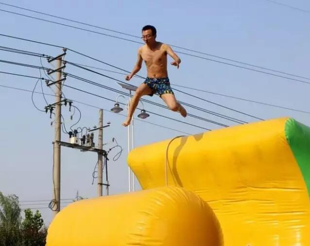 選手爬上2.5米高的充氣臺(tái),從充氣臺(tái)跳到考驗(yàn)原地滾動(dòng)的直徑為1.2米的充氣柱上,從充氣柱上迅速跳刀連接氣墊上。考驗(yàn)選手的膽量和靈活度。